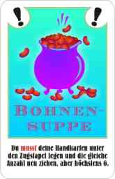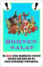 Beim Bohnensalat muss man die Karten, die man auf der Hand hat neu mischen, bei der Bohnensuppe bekommt sogar völlig neue. Man muss seine gesamten Karten, die man auf der Hand hat abgeben und bekommt die gleiche Anzahl zurück, allerdings höchstens 6 Stück. |