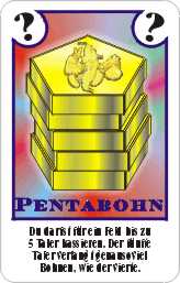 (Beispiele: für 5 Taler benötigt man: 17 Mokka-, 13 Weinbrand-, 10 Feuer-, 8 Soja-, 4 Gartenbohnen, usw.) Mit einem Pentabohn bekommt man natürlich für zwei Schnippelbohnen auch zwei Bohnentaler. |